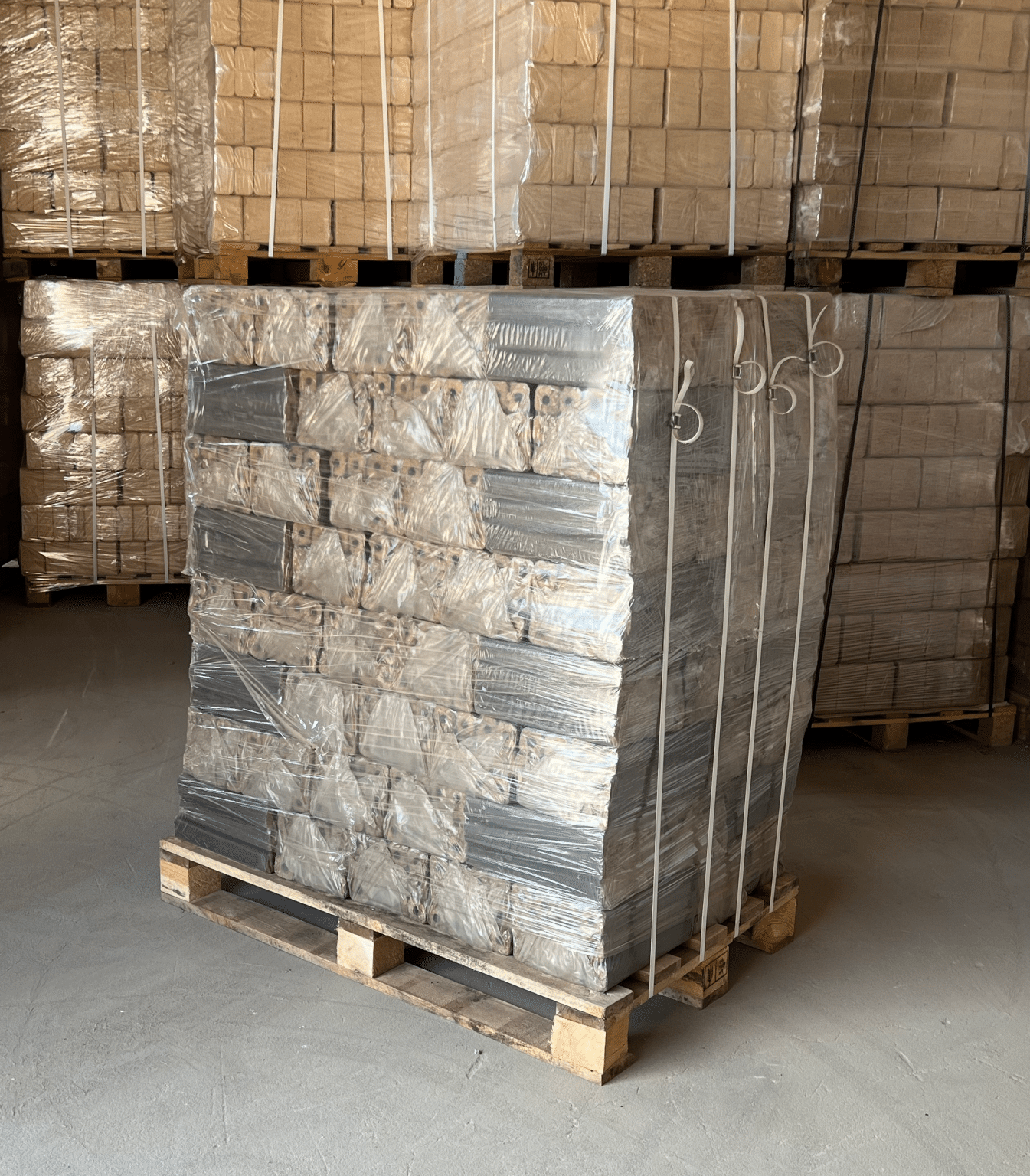 Kaina nurodyta už vieną paletę. Paletėje 96 pakuotės briketų, kiekviena pakuotė sveria 10 kg + / – 5%.